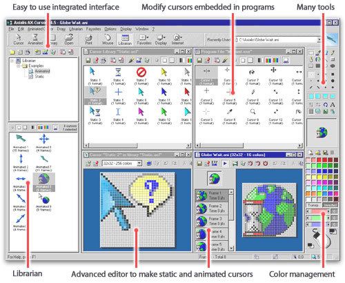 Axialis AX-Cursors features a powerful feature that permits you to create an animated ANI cursor from an Autodesk® FLI/FLC file. Autodesk® FLI is the standard animation format used by 3D modeler applications like 3DS Max® or Cinema 4D®. Just create your 3D object, animate it and save it as FLI. Creating your ANI file will be a childs play with Axialis AX-Cursors.